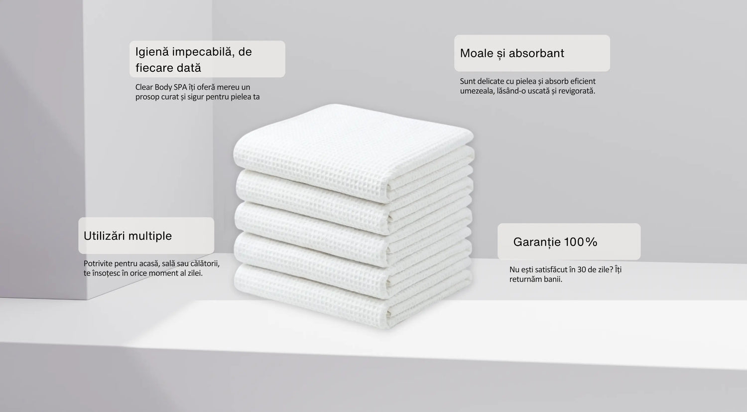 Fibrele groase rețin detergenți industriali, mucegai și bacterii coliforme, mai ales în hoteluri, spa sau piscine. Clear Body Spa reduce expunerea la contaminare deoarece ai mereu cu un prosop nou, sigilat.